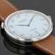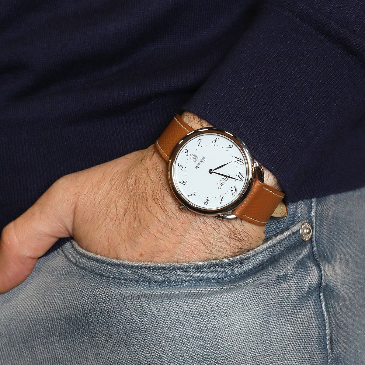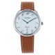 Montre bracelet en acier, cadran blanc avec chiffres arabes, affichage de la date par guichet à 6 heures, lunette stylisée. Mouvement automatique. Bracelet rapporté en cuir marron avec boucle ardillon signée en acier. Signée et numérotée.