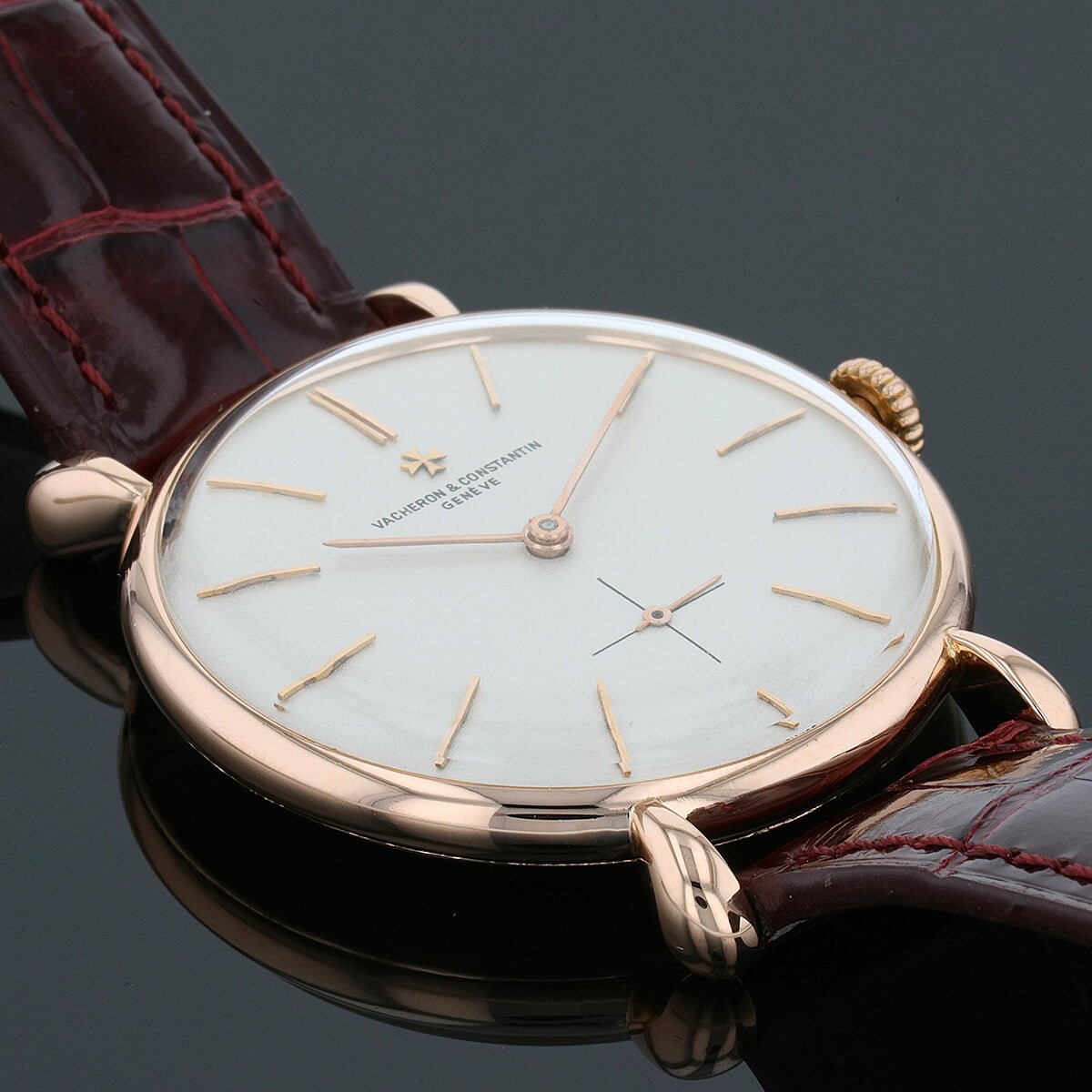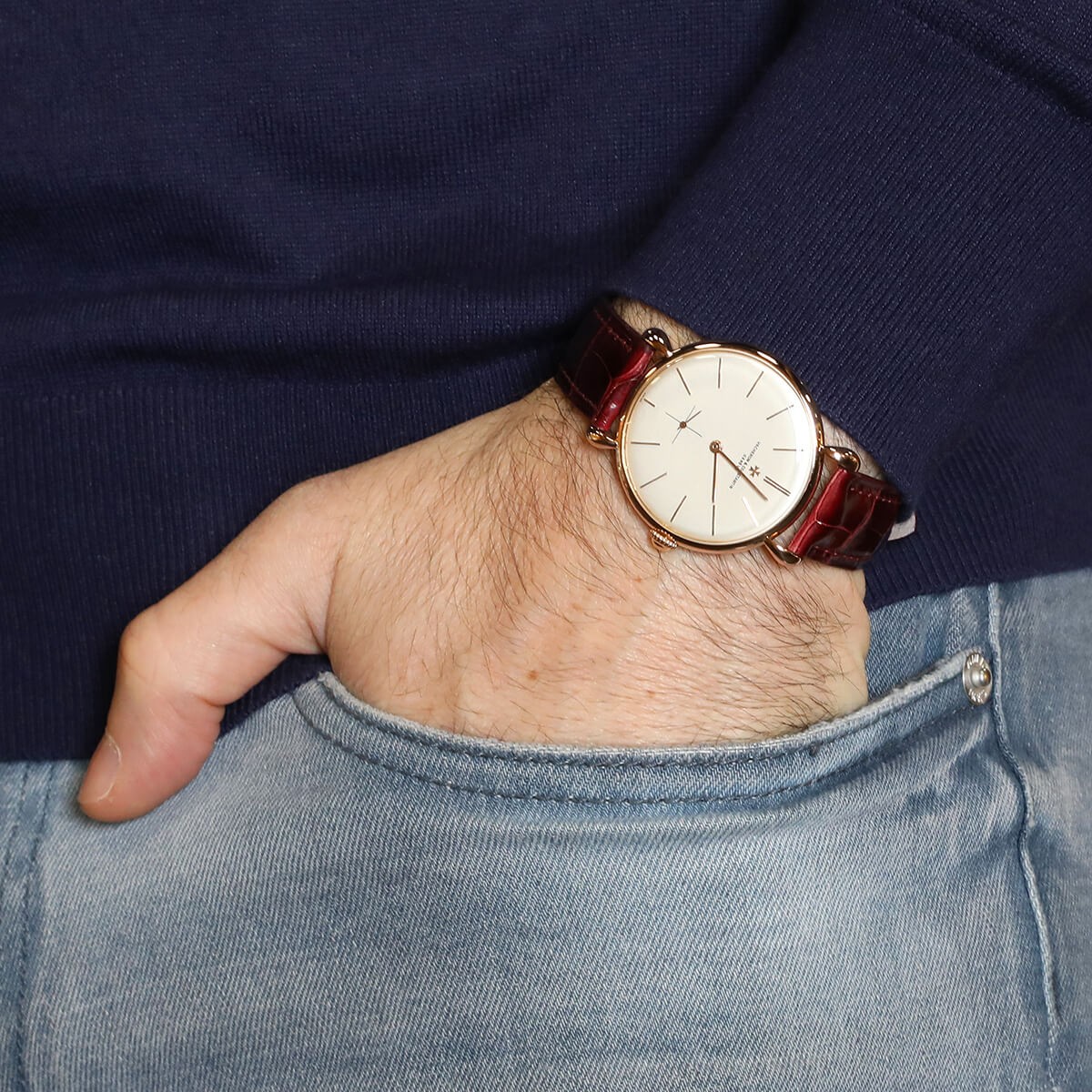 Montre bracelet d’homme en or rose, cadran argenté avec index appliqués, petite trotteuse à 6 heures. Mouvement mécanique. Bracelet crocodile bordeaux rapporté avec boucle ardillon en or rose. Signée. Accompagnée d’un extrait d’archives Vacheron Constantin.
