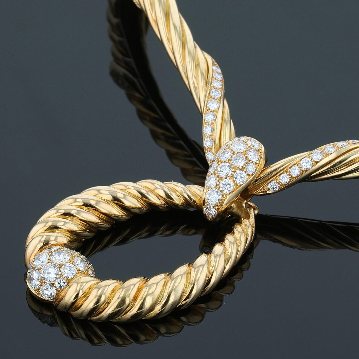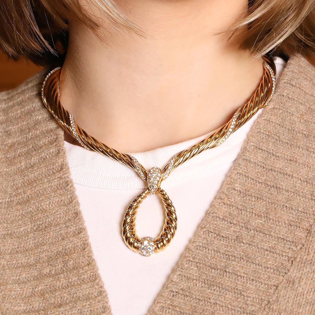 Collier en or jaune, composé d’un tour de cou en or torsadé rehaussé de diamants, retenant un motif ajouré torsadé pavé de diamants, la bélière également sertie de diamants, agrémenté d’un fermoir à cliquet avec sécurité.