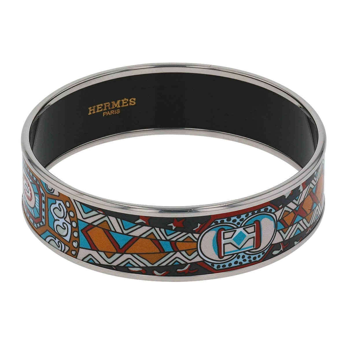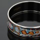 Bracelet en acier et émail, stylisant un motif géométrique dans les tons orange, rouge, turquoise et gris anthracite. Signé.