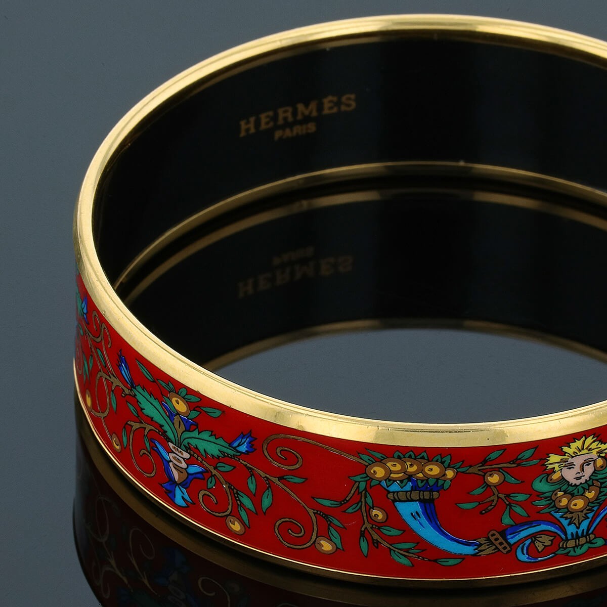 Bracelet en métal doré et émail, à décor de cornes d’abondance, de feuillages et de rinceaux dans les tons bleu, vert et doré sur fond rouge. Signé.