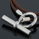 Collier en cuir marron se refermant par un important motif d’anneau ressort en acier. Signé.