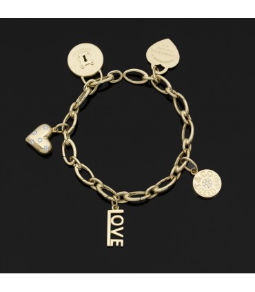 Bracelet en or, maille ovale, orné de 5 “charm’s” stylisants deux coeurs dont un orné de diamants brillantés, un cadenas, le mot “Love” et un disque diamanté. Signé et numéroté.
