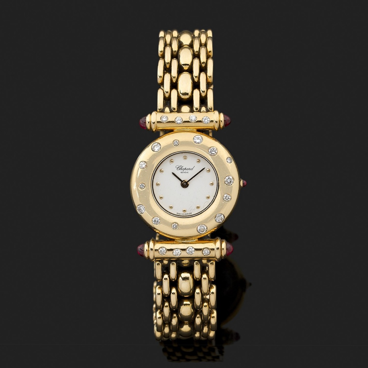 Montre bracelet de femme en or, cadran blanc avec index appliqués, lunette et attaches ponctuées de diamants brillantés et rubis cabochons. Mouvement quartz. Bracelet or, maillons articulés avec fermoir à cliquet. Signée et numérotée 452362915 1.