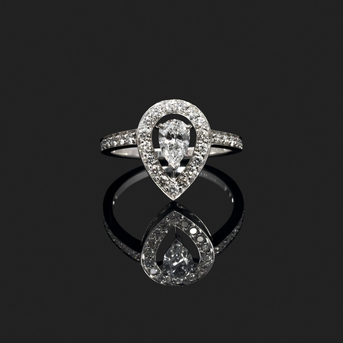 Bague en or blanc, ornée d’un diamant taillé en poire dans un entourage de diamants ronds brillantés. Signée et numérotée CS5137.