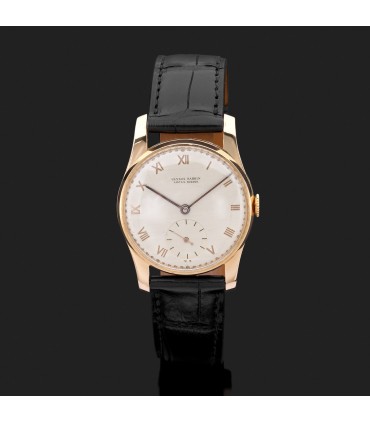 Montre bracelet d’homme en or rose, cadran argenté avec chiffres romains appliqués, petite trotteuse à 6 heures. Mouvement mécanique. Bracelet crocodile avec boucle ardillon en métal doré. Signée.