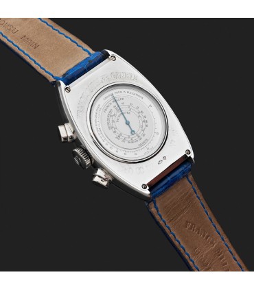 Montre chronographe en platine, cadran argenté 2 compteurs avec chiffres arabes, chemin de fer pour les minutes, fond de boîte rehaussé d’un tachymètre. Mouvement mécanique. Bracelet crocodile avec boucle ardillon en platine. Signée et numérotée 5850 CC DF N°13.
