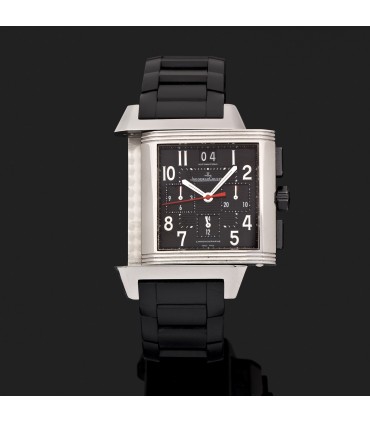 Montre chronographe en acier, cadran noir 3 compteurs avec chiffres arabes, affichage d’une grande date à 12 heures et d’un second fuseau horaire à 6 heures, boîtier réversible dévoilant un fond transparent abritant un mouvement automatique. Bracelet caoutchouc, maillons articulés avec boucle déployante en acier. Signée et numérotée 230.8.45 / 2595509.