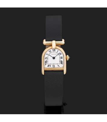 Montre bracelet de femme en or jaune, cadran blanc avec chiffres romains peints, chemin de fer pour les minutes, lunette stylisée en forme d’étrier. Mouvement quartz. Bracelet satin neuf avec boucle ardillon en or jaune. Signée et numérotée 660300021.