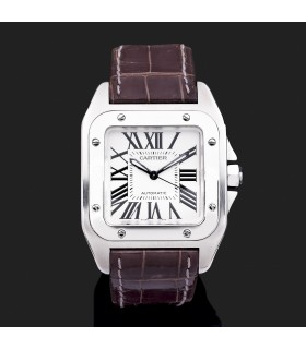 Montre bracelet de femme en acier, cadran argenté avec chiffres romains peints, chemin de fer pour les minutes, lunette stylisée à décor de vis. Mouvement automatique. Bracelet crocodile avec boucle déployante réglable en acier. Signée et numérotée 454738RX.