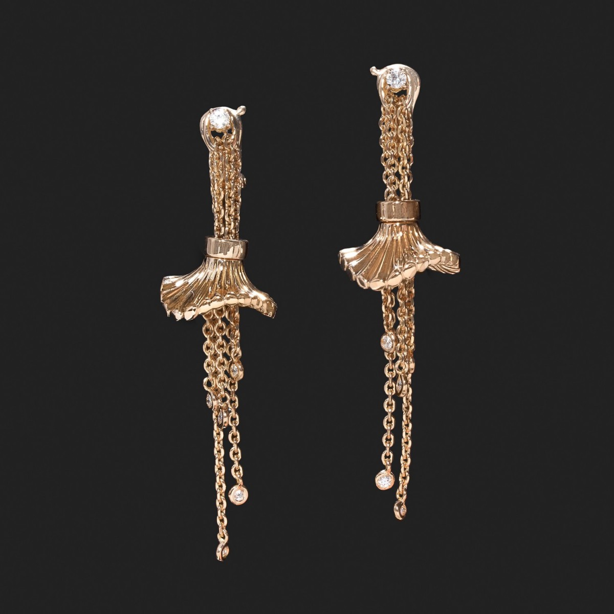 Boucles d’oreilles en or rose, à décor géométrique retenant en pampille 5 chaînettes ponctuées de diamants. Signées et numérotées E58280.