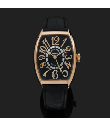 Montre bracelet d’homme en or rose, cadran noir avec chiffres arabes, chemin de fer pour les minutes. Mouvement automatique. Bracelet crocodile avec boucle ardillon en or rose. Signée et numérotéé 158 7851 SC.