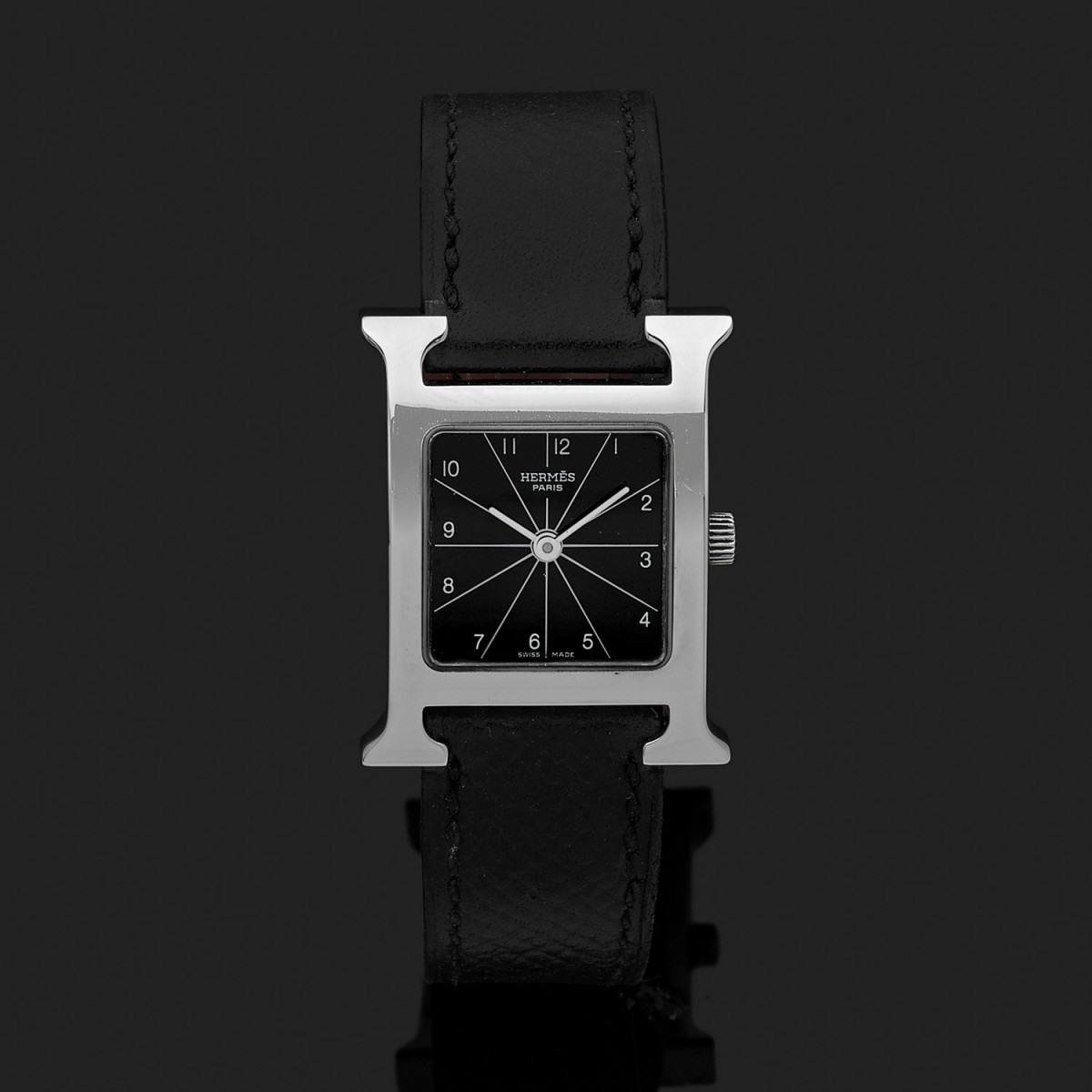 Montre bracelet de femme petit modèle en acier, cadran noir stylisé avec chiffres arabes, lunette à décor de ''H''. Bracelet cuir noir avec boucle ardillon en acier. Signée et numérotée HH1.210 1667058.