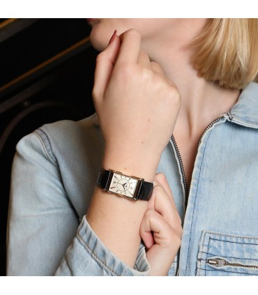 Montre bracelet en or jaune, cadran doré patiné avec chiffres arabes et index appliqués, chemin de fer pour les minutes. Mouvement mécanique. Bracelet rapporté en crocodile noir neuf avec boucle ardillon en métal doré. Signée et numérotée.