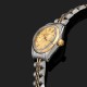 Montre bracelet de femme en or jaune et acier, cadran doré rayonnant avec index appliqués, affichage de la date par guichet à 3 heures, lunette en or jaune strié. Mouvement automatique. Bracelet or jaune et acier, maillons jubilé avec boucle déployante réglable en acier. Signée et numérotée 6917F / 5839761.