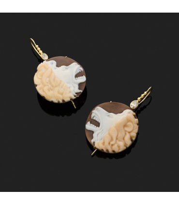 Boucles d’oreilles en or jaune, ornées de camées sur coquille, gravés d’une tête de lion rugissante, surmontées de diamants ovales.