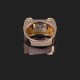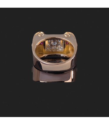 Bague tank en or jaune et platine, ornée d’un pavage de diamants, épaulé d’enroulements rehaussés de pierres rouges calibrées.