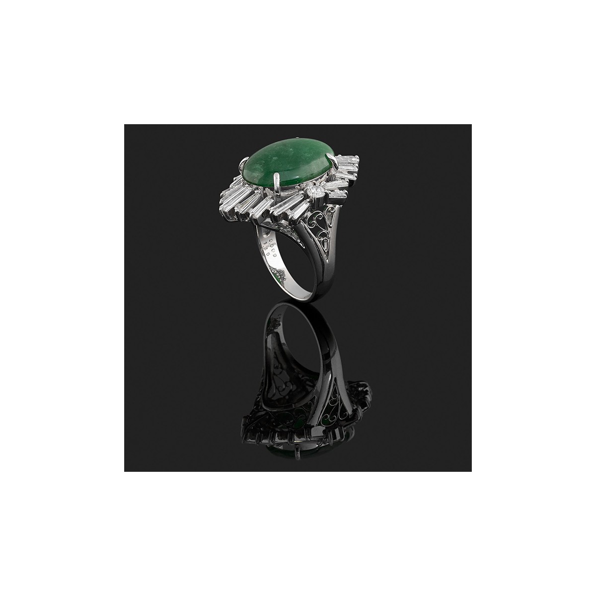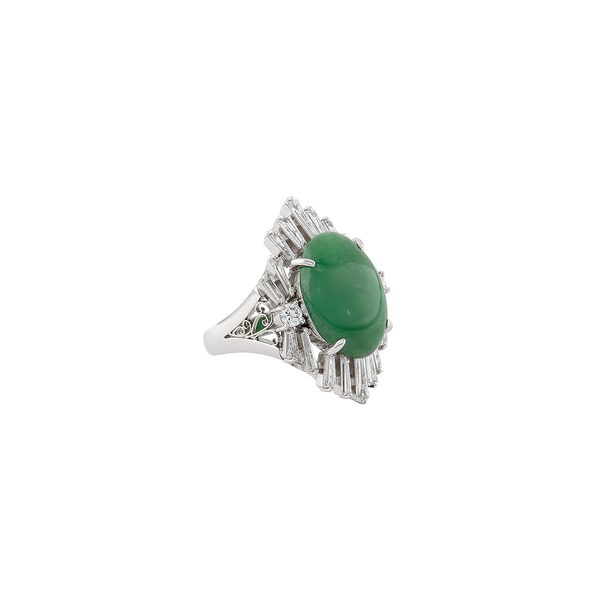 Bague en platine, ornée d’un jade ovale en cabochon, entouré de diamants taille tapers et ronds diamantés.