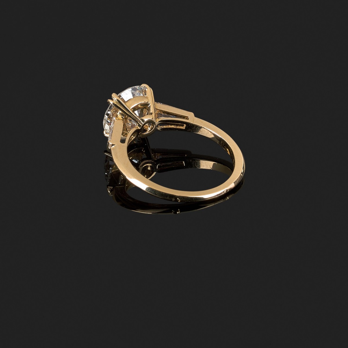 Bague solitaire en or jaune, ornée d’un diamant en serti double griffe, épaulé de diamants tapers. Signée et numérotée PC 981003. Accompagnée d’un certificat LFG attestant d’un diamant de 3,03 cts, couleur I, pureté SI2.