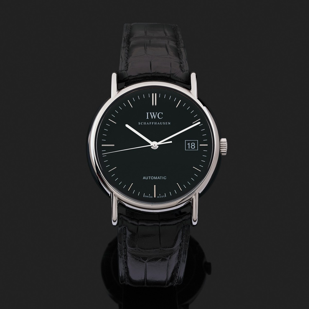 Montre bracelet d’homme en acier, cadran noir avec index, affichage de la date par guichet à 3 heures. Bracelet crocodile noir avec boucle déployante réglable en acier. Signée et numérotée 3037362.