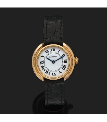 Montre bracelet de femme en or jaune, cadran blanc avec chiffres romains peints, chemin de fer pour les minutes, lunette double godron. Mouvement mécanique. Bracelet crocodile noir avec boucle déployante réglable en or jaune. Signée et numérotée 670802763.