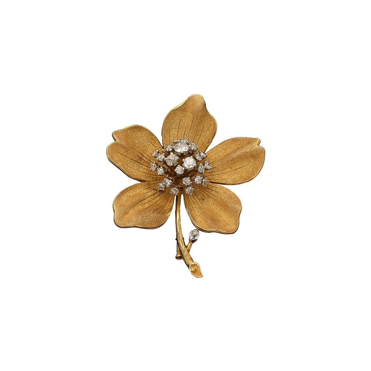 Broche en or jaune satiné, stylisant une fleur le pistil orné de diamants taille ancienne.