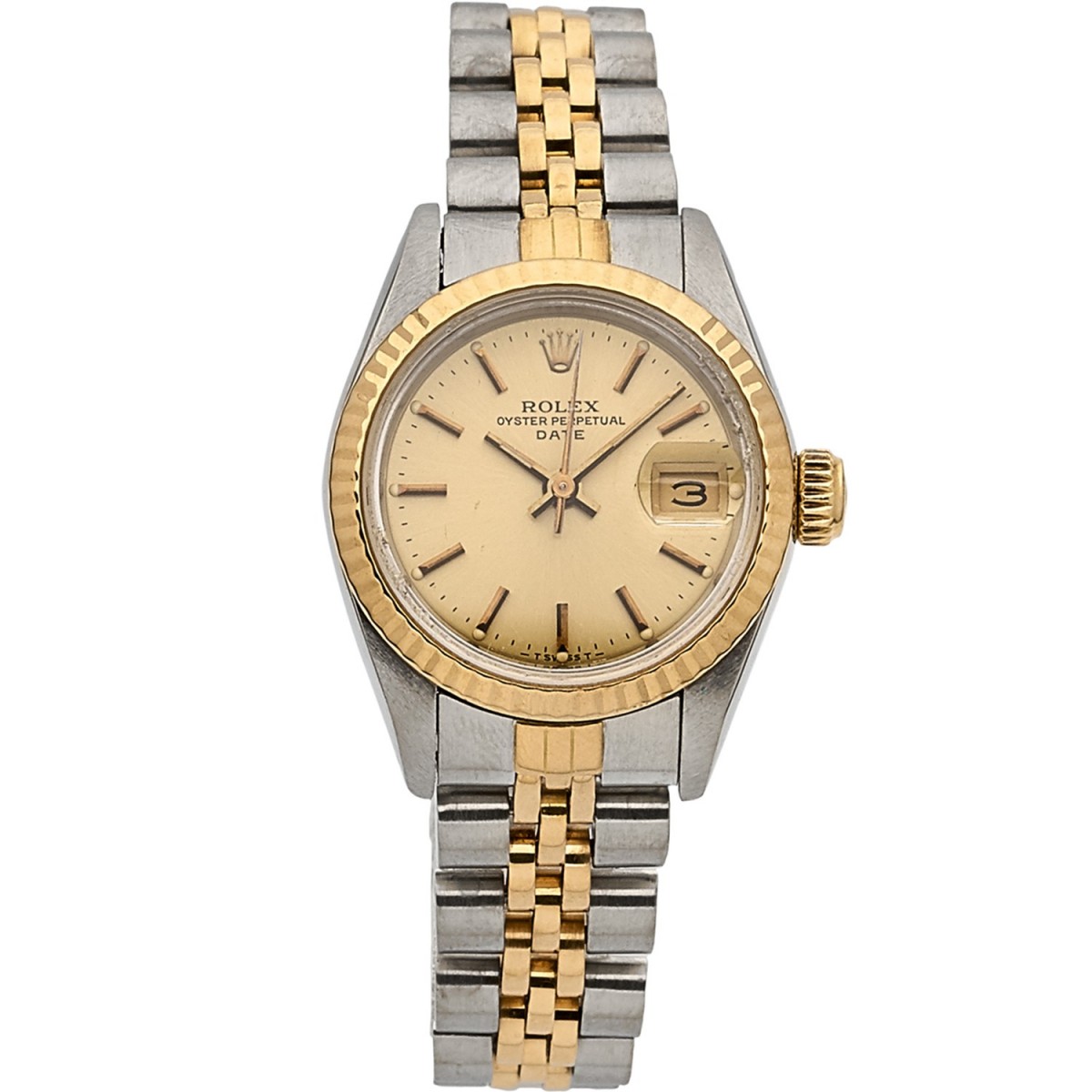 Montre bracelet de femme en or jaune et acier, cadran doré rayonnant avec index, affichage de la date par guichet à 3 heures, lunette striée en or jaune. Mouvement automatique. Bracelet or jaune et acier, maillons jubilé avec boucle déployante réglable en acier. Signée et numérotée 69173 / 8407062.