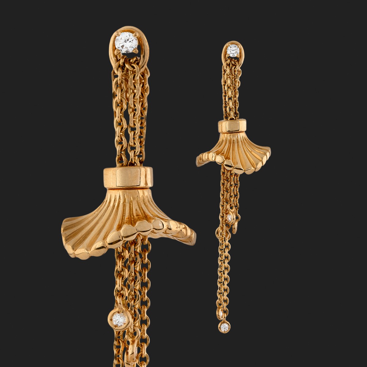 Boucles d’oreilles en or rose, à décor de corolle retenant en pampille 5 chaînettes ponctuées de diamants. Signées et numérotées E58264.