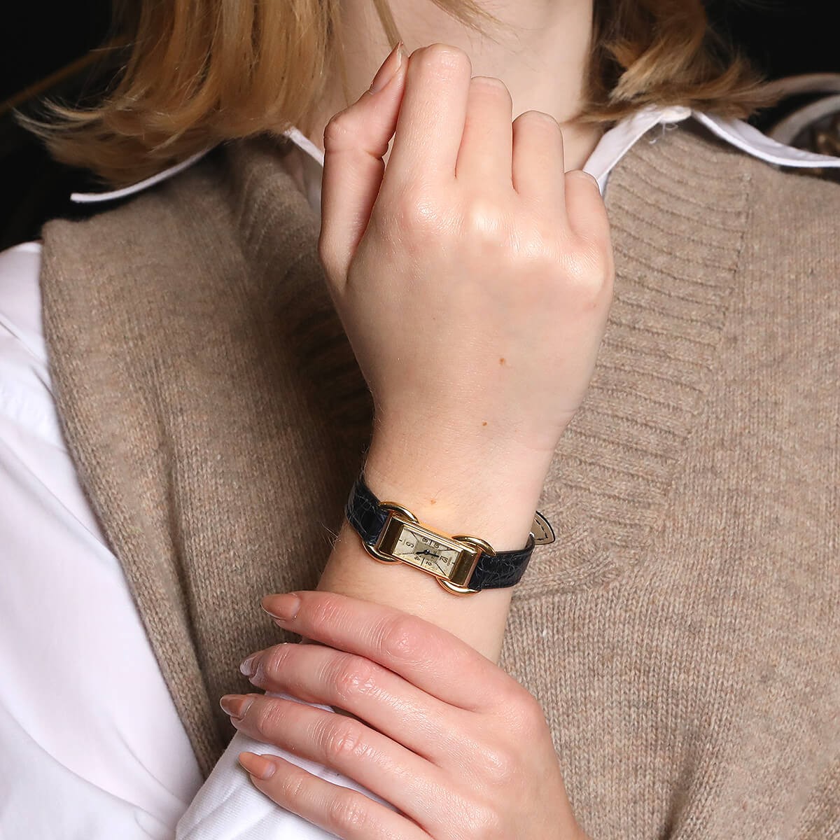 Montre bracelet de femme en or jaune, cadran ivoire patiné avec index et chiffres arabes, lunette stylisant des étriers. Mouvement mécanique duoplan. Bracelet rapporté en crocodile bleu avec boucle ardillon en or jaune. Signée et numérotée.