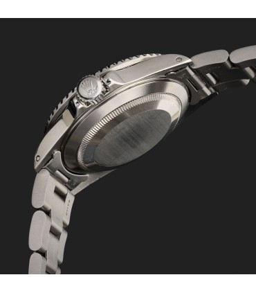 Montre bracelet d'homme en acier, cadran noir avec index appliqués luminescents, affichage de la date par guichet à 3 heures, lunette tournante unidirectionnelle graduée. Mouvement automatique. Bracelet acier, maillons oyster avec boucle déployante réglable en acier. Signée et numérotée 16610/ K 266125.
