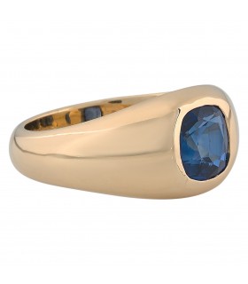 Bague jonc en or jaune, ornée d’un saphir taille coussin en serti clos. Accompagnée d’un certificat LFG n° 327494 du 12/10/2017 attestant d’un saphir de 1,55 ct, origine Thaïlande, pas de traitement thermique constatée.