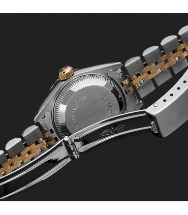 Montre bracelet de femme en or jaune et acier, cadran doré avec index appliqués, affichage de la date par guichet à 3 heures, lunette en or jaune cannelé. Mouvement automatique. Bracelet or jaune et acier, maillons jubilé avec boucle déployante réglable en acier. Signée et numérotée 69173 / 8116586.