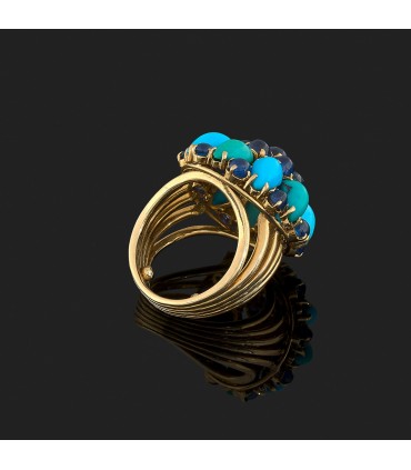 Bague en or jaune, stylisant une fleur pavée de turquoises et de saphirs en cabochon.