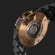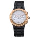 Montre chronographe en or rose et céramique, cadran blanc deux compteurs nacrés avec index, affichage de la date par guichet à 6 heures, lunette graduée en or rose. Fond transparent dévoilant son mouvement automatique. Bracelet céramique noire avec boucle déployante en acier noir. Signée et numérotée 909-0079-P.