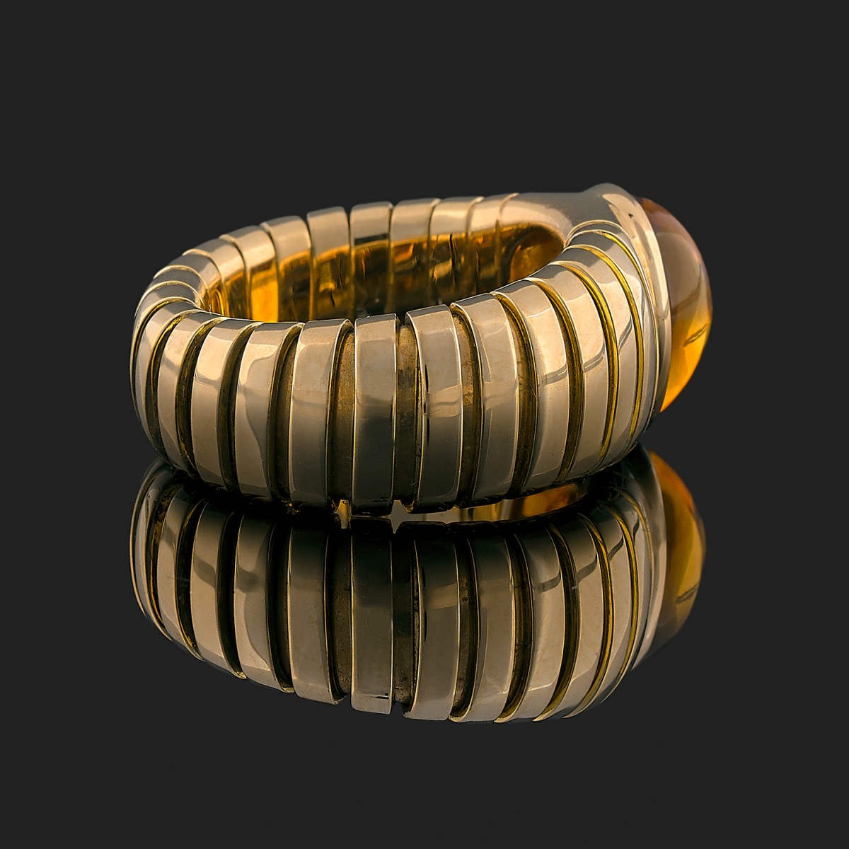 Bague en or jaune, composée d’une maille tubogas ornée d’une citrine cabochon. Signée.