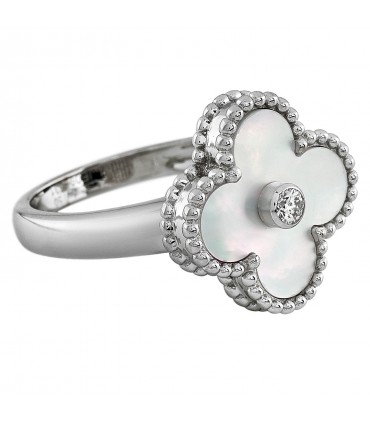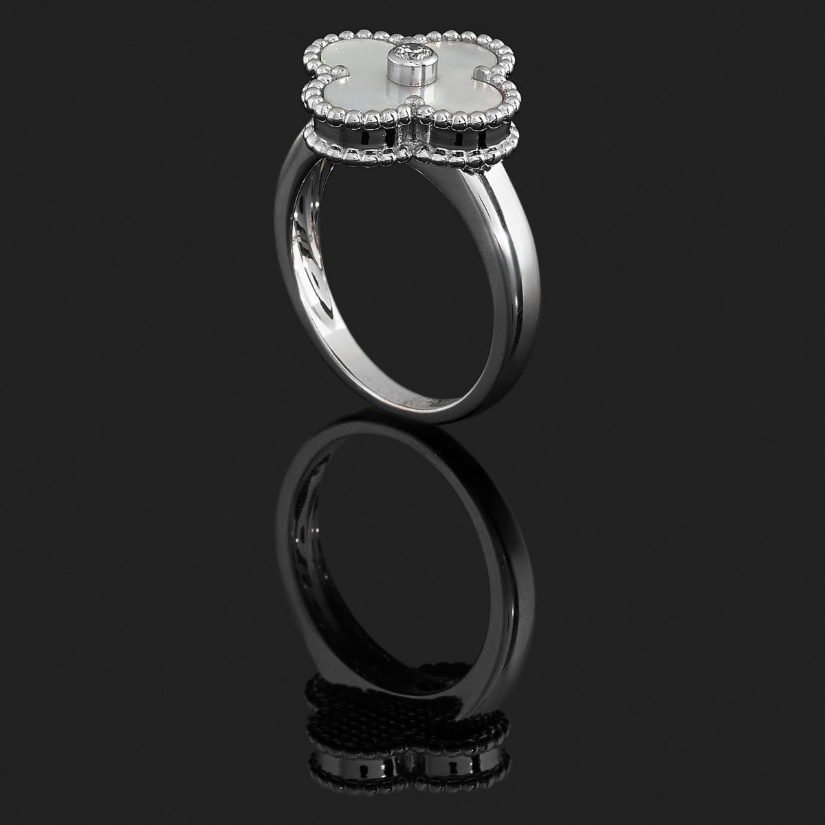 Bague en or blanc, stylisant le motif Alhambra en nacre ponctué d’un diamant. Signée et numérotée.