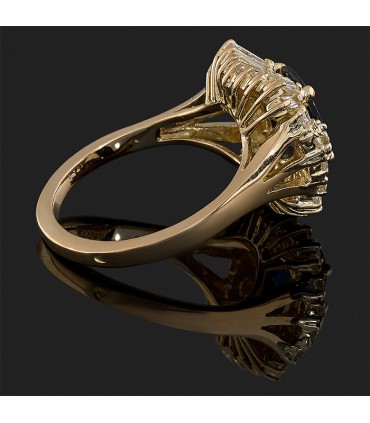 Bague en or jaune, ornée d’un saphir ovale entouré de diamants ronds et taille baguette.