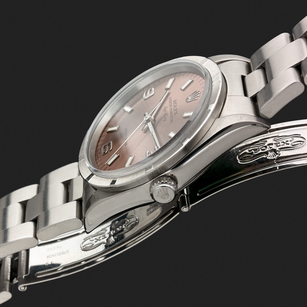 Montre bracelet en acier, cadran rosé rayonnant avec index bâtons appliqués, lunette striée. Mouvement automatique. Bracelet acier, maillons oyster avec boucle déployante réglable en acier. Signée et numérotée.