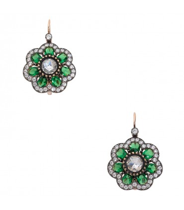 Boucles d’oreilles en or jaune, centrées d’un diamant taillé en rose en serti clos dans un entourage polylobé de grenats tsavorites et diamants.
