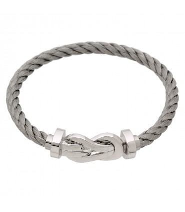Bracelet en or blanc, stylisant un motif noeud d’hercule retenu par torsade interchangeable. Signé et numéroté. Accompagné d’un bracelet noir double tour.
