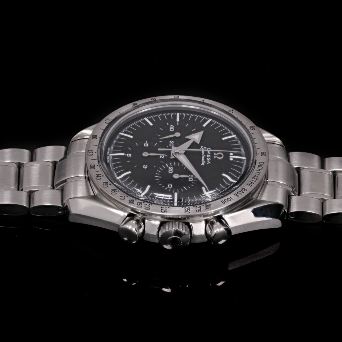 Montre chronographe en acier, cadran noir 3 compteurs avec index, lunette rehaussée d’un tachymètre. Mouvement mécanique. Bracelet acier, maillons articulés avec boucle déployante réglable en acier. Signée et numérotée.
