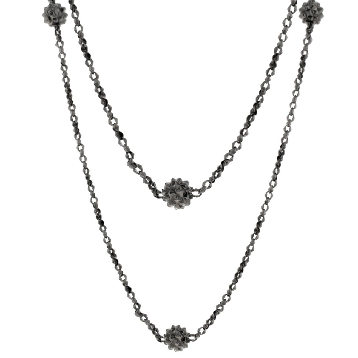 Sautoir en argent noirci, maille fantaisie intercalée de motifs boule à décor pyramidale.