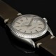 Montre bracelet en acier, cadran argenté avec index appliqués, affichage de la date par guichet à 3 heures, lunette cannelée en acier. Mouvement automatique. Bracelet cuir marron avec boucle ardillon en acier. Signée et numérotée réf 1603.