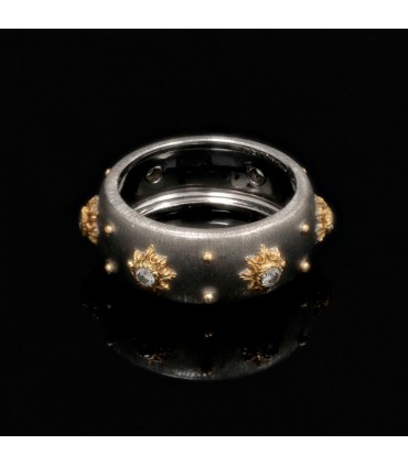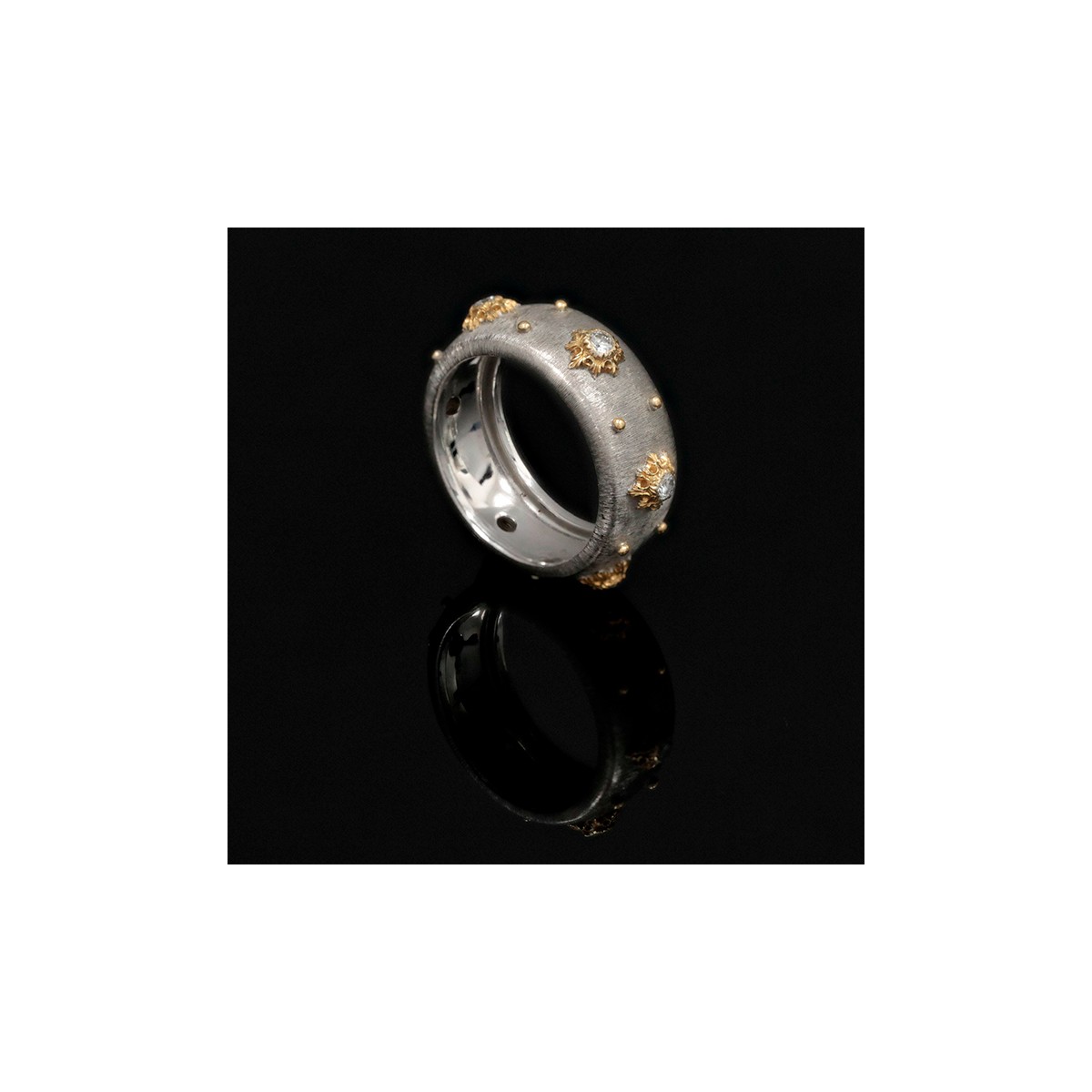 Bague en or blanc ciselé, ponctuée de diamants ronds en serti clos or jaune. Signée et numérotée.