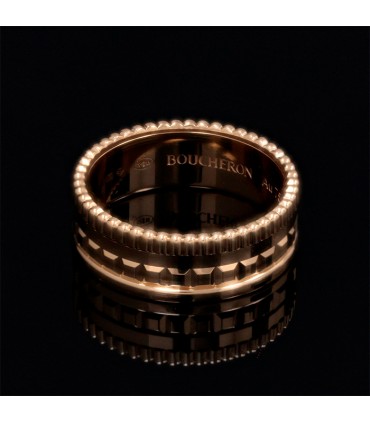 Bague large en or jaune, stylisant 4 anneaux travaillé en relief aux motifs gros grain, lisse poli, clous de paris et godron. Signée et numérotée.