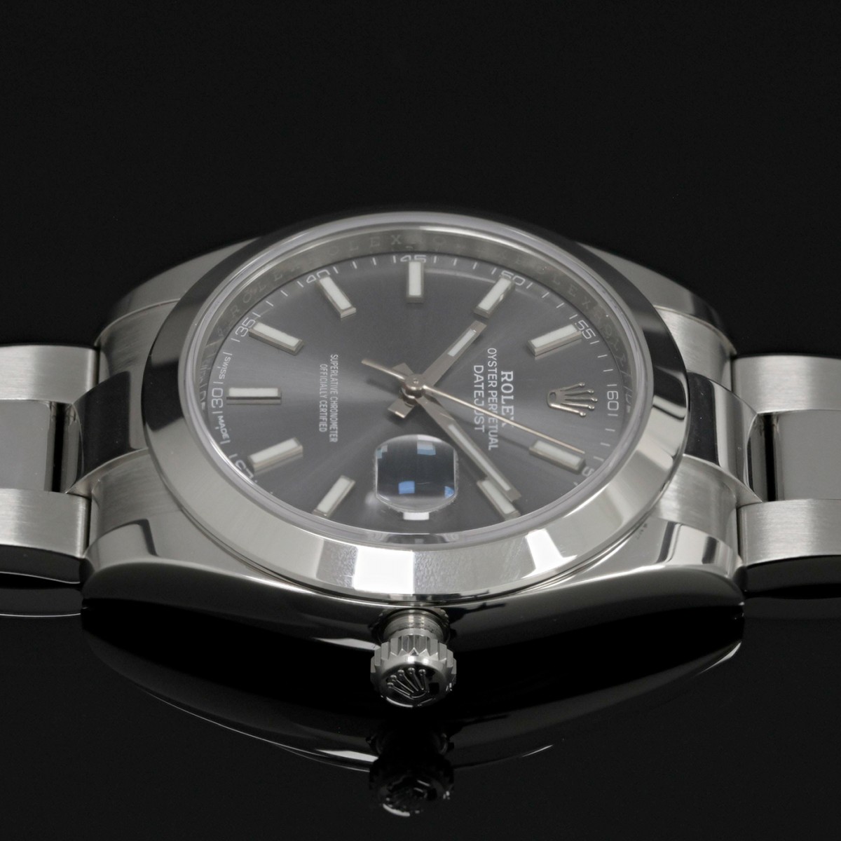 Montre bracelet d’homme en acier, cadran gris rayonnant avec index appliqué, affichage de la date par guichet à 3 heures. Mouvement automatique. Bracelet en acier, maillons oyster avec boucle déployante réglable en acier. Signée et numérotée réf. 126300.