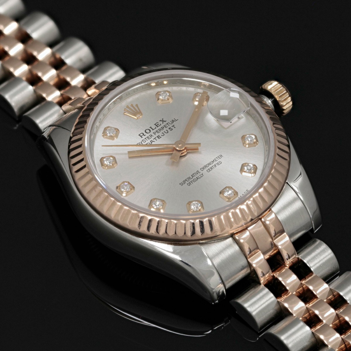 Montre bracelet de femme en or rose et acier, cadran argenté rayonnant avec index diamants, affichage de la date par guichet à 3 heures, lunette en or rose cannelé. Mouvement automatique. Bracelet or rose et acier, maillons jubilé avec boucle déployante. Signée et numérotée réf. 178271.