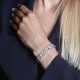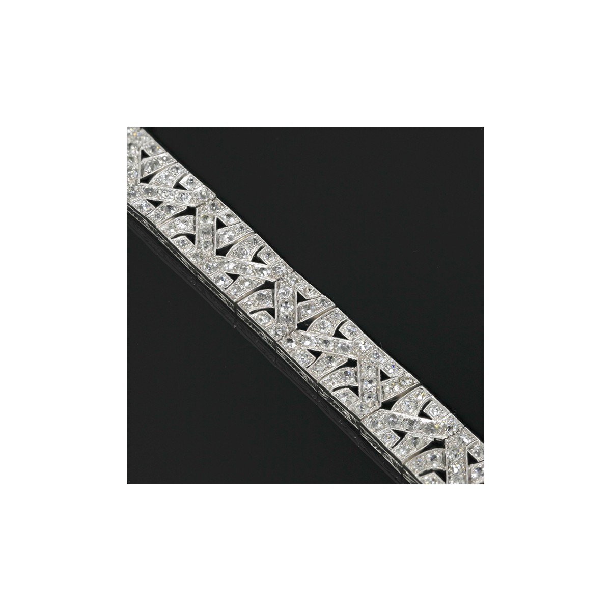 Bracelet art déco en or blanc, composé de maillons à décor géométrique ajouré ornés de diamants taille ancienne, agrémenté d’un fermoir invisible à cliquet avec sécurité.