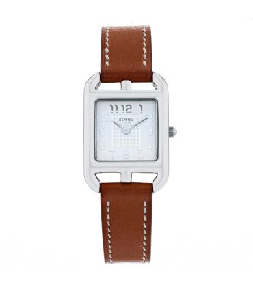 Montre bracelet petit modèle en acier, cadran argenté guilloché avec chiffres arabes, lunette stylisée. Mouvement quartz. Bracelet en cuir marron avec boucle ardillon en acier. Signée et numérotée.