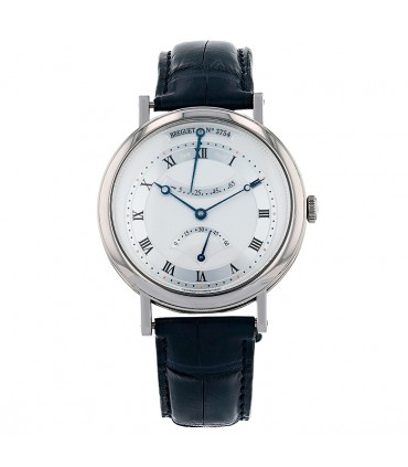 Montre bracelet d’homme en or blanc, cadran en or argenté guilloché à la main avec tour d’heures excentré, petite seconde rétrograde à 6 heures, réserve de marche 65 h. Fond transparent en saphir dévoilant son mouvement automatique. Bracelet crocodile noir avec boucle déployante réglable. Signée et numérotée.